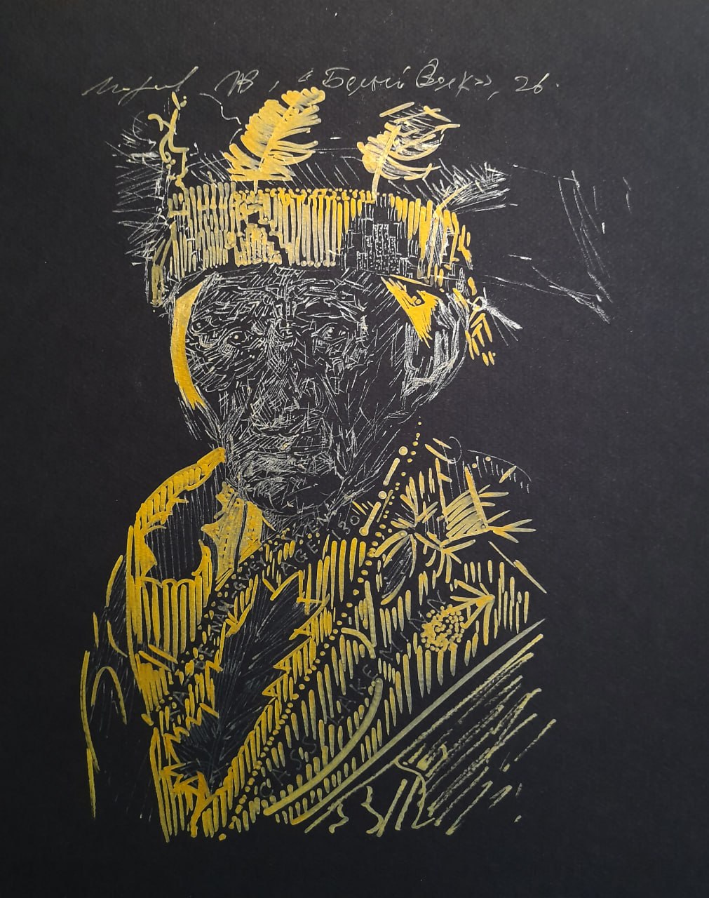 Каждый его лист – это своеобразный крипто текст с массой явной и зашифрованной информацией, значение которой априори не поддаётся распознанию. То, что предложено зрителю надо просто разглядывать, как разглядывают искусство китайских живописцев эпохи «Перемен» или «Сражающихся царств», не озадачивая себя его содержанием и историческим контекстом. И если обратиться к содержанию новой серии, то оно как бы сокрыто своим названием, уводящим вовне и лишь приоткрывающим потаённые глубины замысла. «Эвонская лебединая» — это опять парадокс, неожиданным образом воскрешающий в памяти место рождения Уильяма Шекспира, о котором в данной серии ни слова. Здесь название не формула, определяющая содержание выставки, это её поэтическая метафора, музыкальная интонация, созвучная образам великих композиторов, скрупулёзно отрисованных автором и ставших тематической доминантой выставки. Здесь каждый портрет это внимательная, особенно к деталям, перерисовка известных прижизненных изображений классиков мирового музыкального искусства. Но речь, не о механическом копировании, не о развёрнутой постмодернистской цитате, а о «погружении в образ» извлечённый из архива виртуальных библиотек, где в фокусе интересов автора оказывается совокупность визуальной схожести, страниц биографии и музыкального ряда. Но и здесь Александр не замыкается на портретируемой личности, а передаёт нечто большое; вскрывает особые смыслы, извлечённые из неведомых пластов своего сознания и проецирует на поверхность бумаги ввиде графического рисунка, обрамлённого каллиграфией трудно воспроизводимых, почти иероглифических текстов вплетённых в единую ткань произведения.