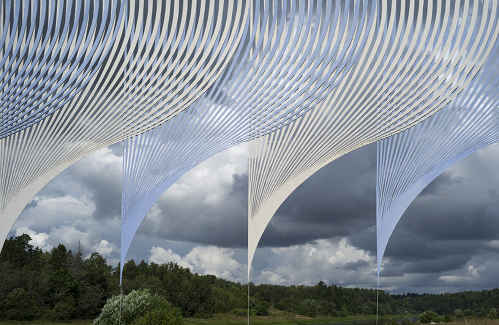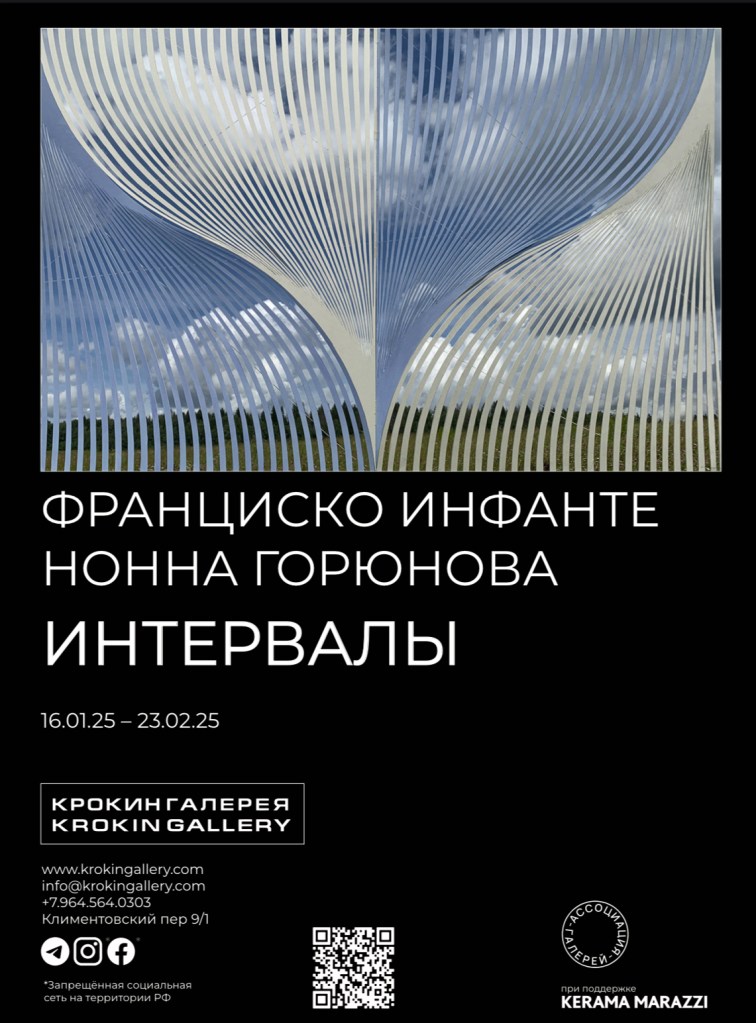 Артефакты, созданные Инфанте и Нонной Горюновой в 2024 году, движутся по этой траектории: спираль (или скорее ее вариации), теперь развернутая в вертикальные, горизонтальные или даже диагональные структуры, накладывается колеблющейся и закрывающий вид пеленой на природный ландшафт полей, холмов, озер, солнца и снега. Изысканные эллипсы подобны отзвукам клочковатых облаков в вышине, завивающиеся ввысь мембраны ‒ как отголоски беспокойных листьев и пучков трав, а рассчитанные на зрительное восприятие звуковые волны эхом вторят ритмичному ряду деревьев. Изредка изгибы будто бы появляются из глубины горизонта, намекая на «божественный взгляд», передаваемый с помощью обратной перспективы в иконе, с которой Бог созерцает мир со Своей точки зрения, то есть из-за горизонта позади нас. В свою очередь, воспроизводство и повторение следов спирали приводят к возможности целого ряда толкований и обобщений, которые не только расширяют «смысл» и цель эстетического поиска Инфанте, но также указывают на ряд возможных и даже парадоксальных выводов.