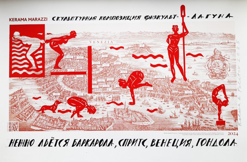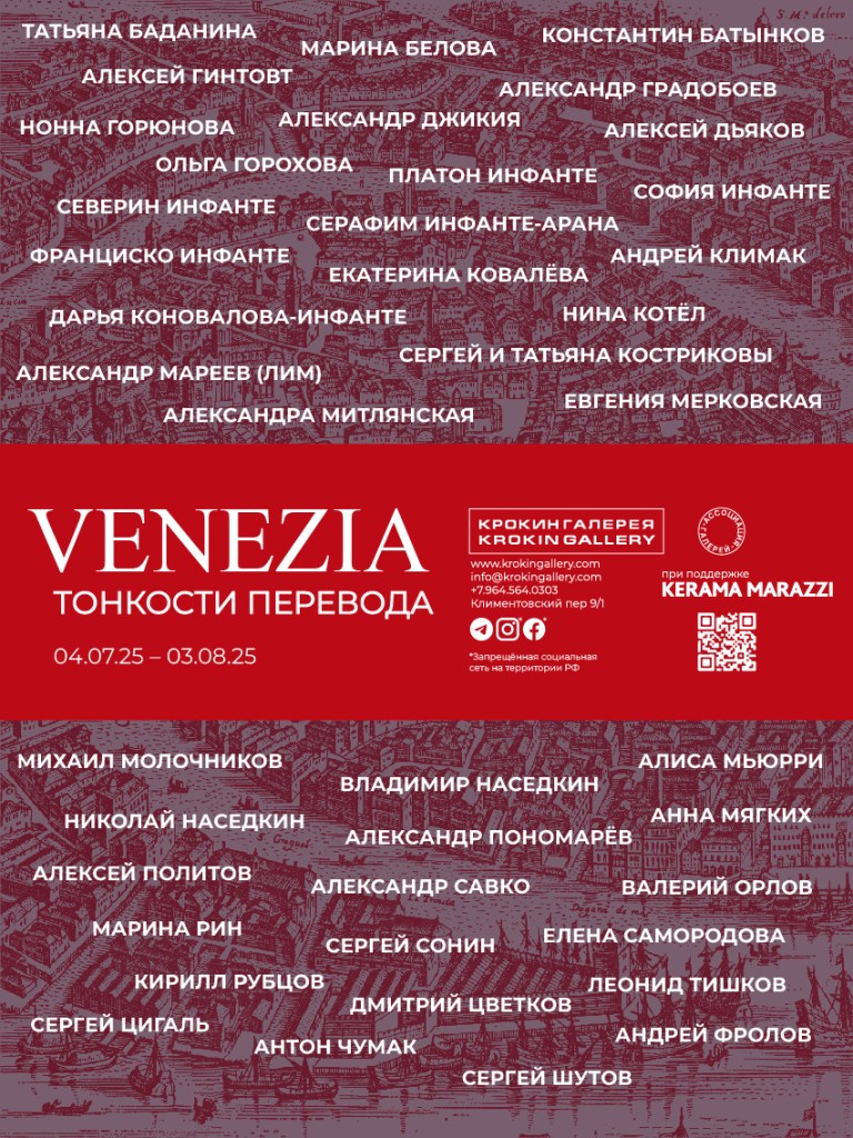 Испытывая особые чувства к «несравненной Венеции», компания KERAMA MARAZZI подарила современным художникам постер, посвященный Венецианской коллекции бренда, с напечатанной на нём картой легендарного города, что возымело живую реакцию и переформатировало многотиражный «мерч» в уникальное произведение искусства. Карта Венеции XVII столетия, изображённая на современной бумаге, синтезировала не только новый социокультурный продукт, но и стала неожиданной платформой, заключающей в себе огромный потенциал прочтения и реализации предельно индивидуального взгляда на мифологизированную «жемчужину Адриатики». Проект выставки изначально не содержал регламентаций и кураторских установок; только формат карты и условности графического изображения Венеции, что открывало перед авторами хорошо освоенное ими пространство «вольного прочтения». В результате появилось нечто новое, воспроизводящее дополненную реальность и вживляющее в застывшую картографию что-то очень личное, уходящее далеко за административные границы конкретного города в области тонкой игры со смыслами и геолокацией.